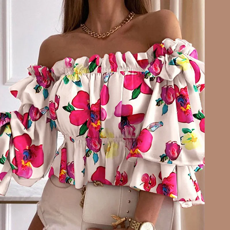 Женская блузка в горошек, с оборками и расклешенными рукавами, летняя, эластичная, с открытыми плечами