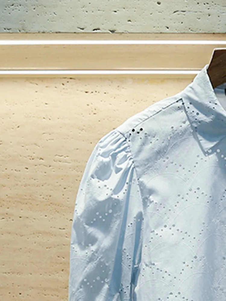Женская блузка с вышивкой и рукавами-фонариками, голубая однобортная ажурная блузка с отложным воротником, лето 2023