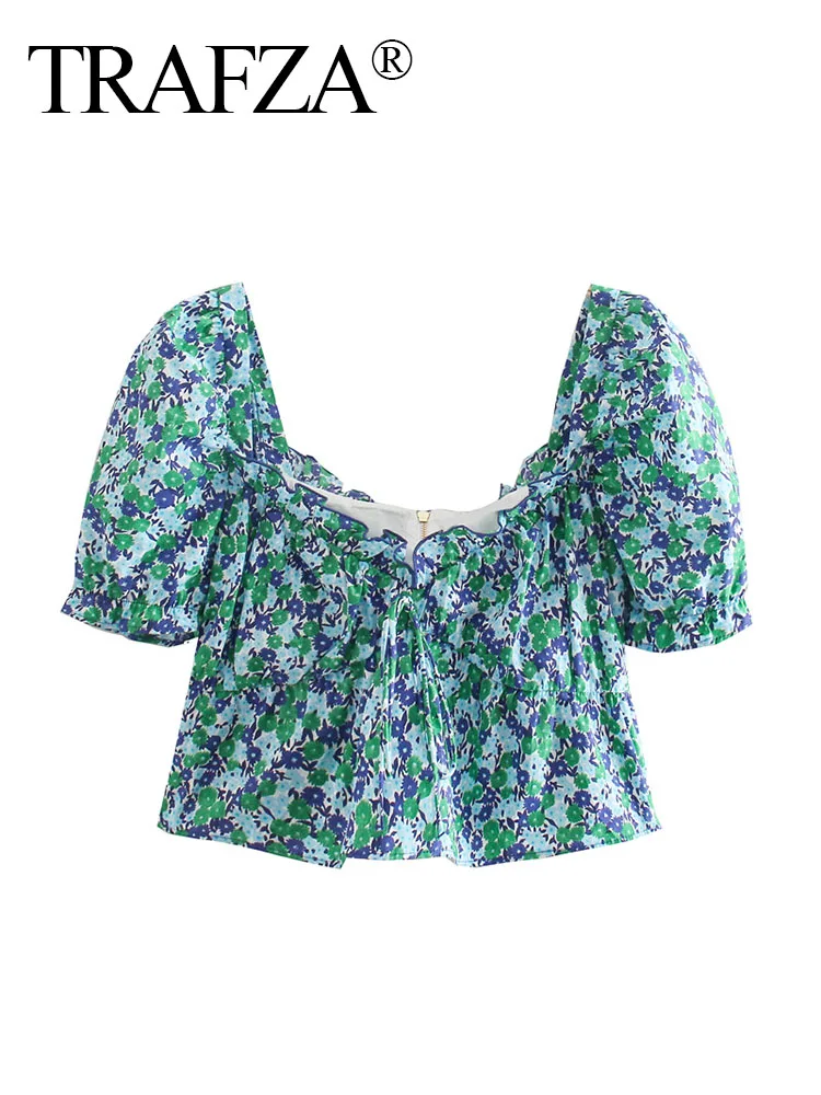 Женская блузка с короткими рукавами-фонариками и квадратным воротником на молнии