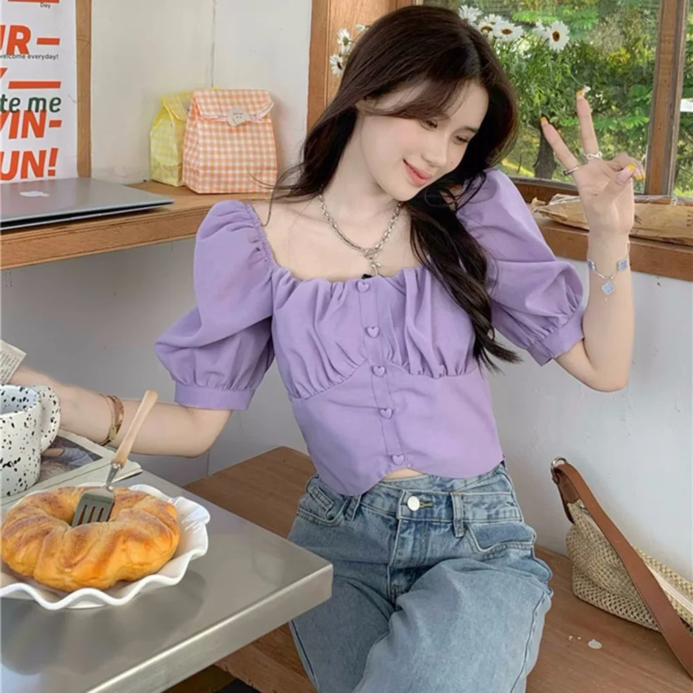 Женская блузка с коротким рукавом, элегантная Фиолетовая рубашка с квадратным вырезом, в Корейском стиле, лето 2023