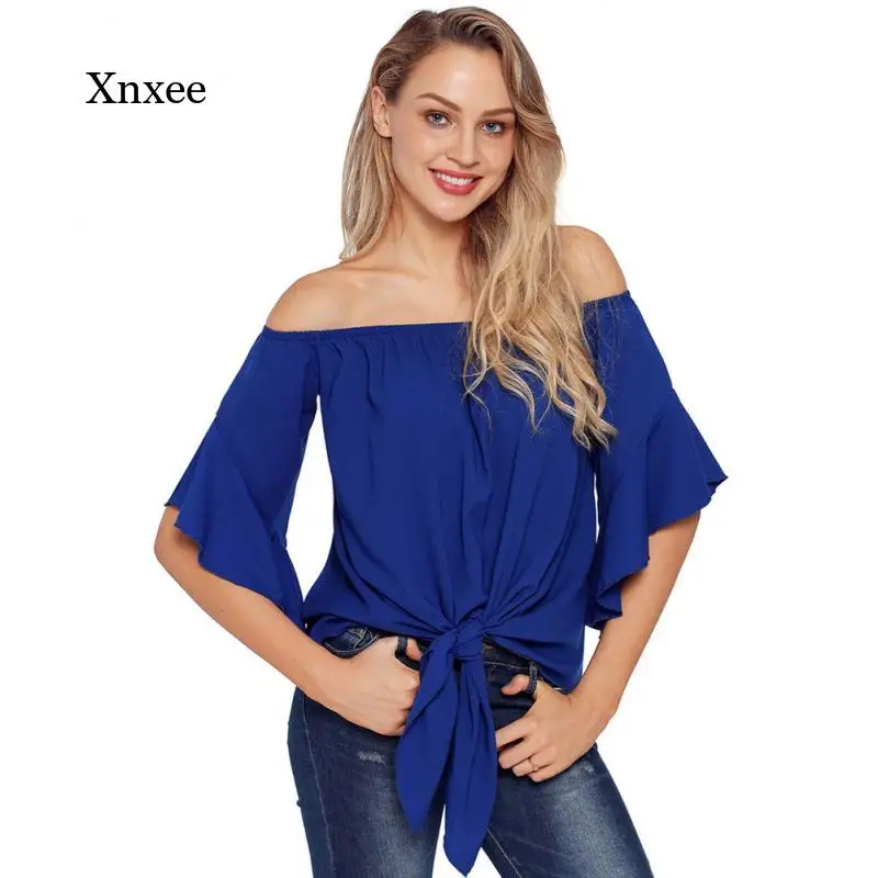 Женская блузка с открытыми плечами и расклешенными рукавами, с воротником-лодочкой, женская рубашка на шнуровке, новинка 2021, однотонный пов...