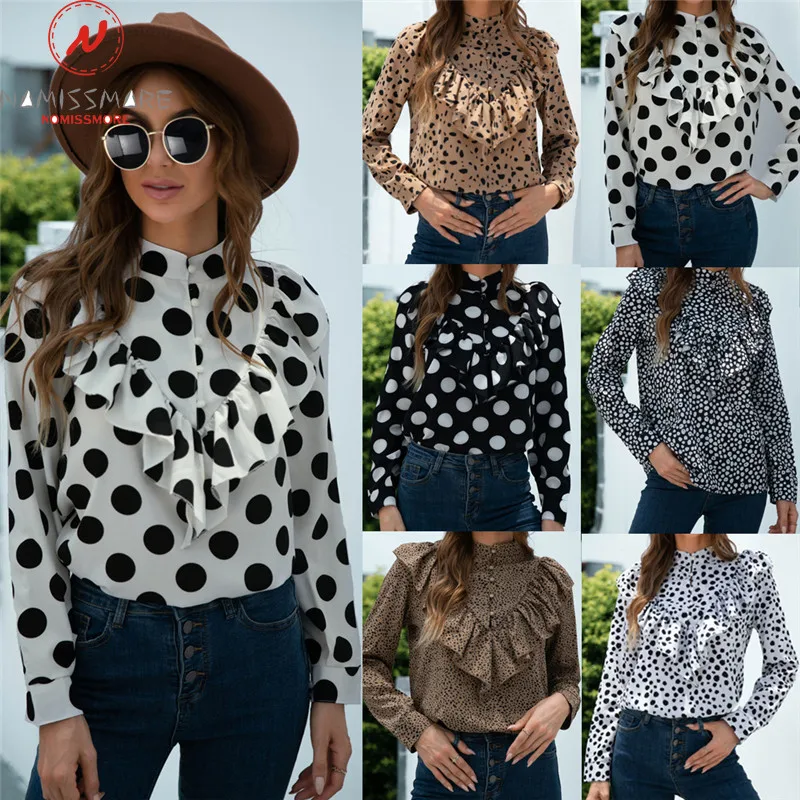 Женская блузка с принтом в горошек, с оборками и пуговицами, осенне-весенние пуловеры с длинным рукавом и круглым вырезом