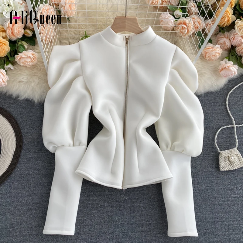 Женская блузка с рукавами-фонариками и воротником-стойкой, на молнии