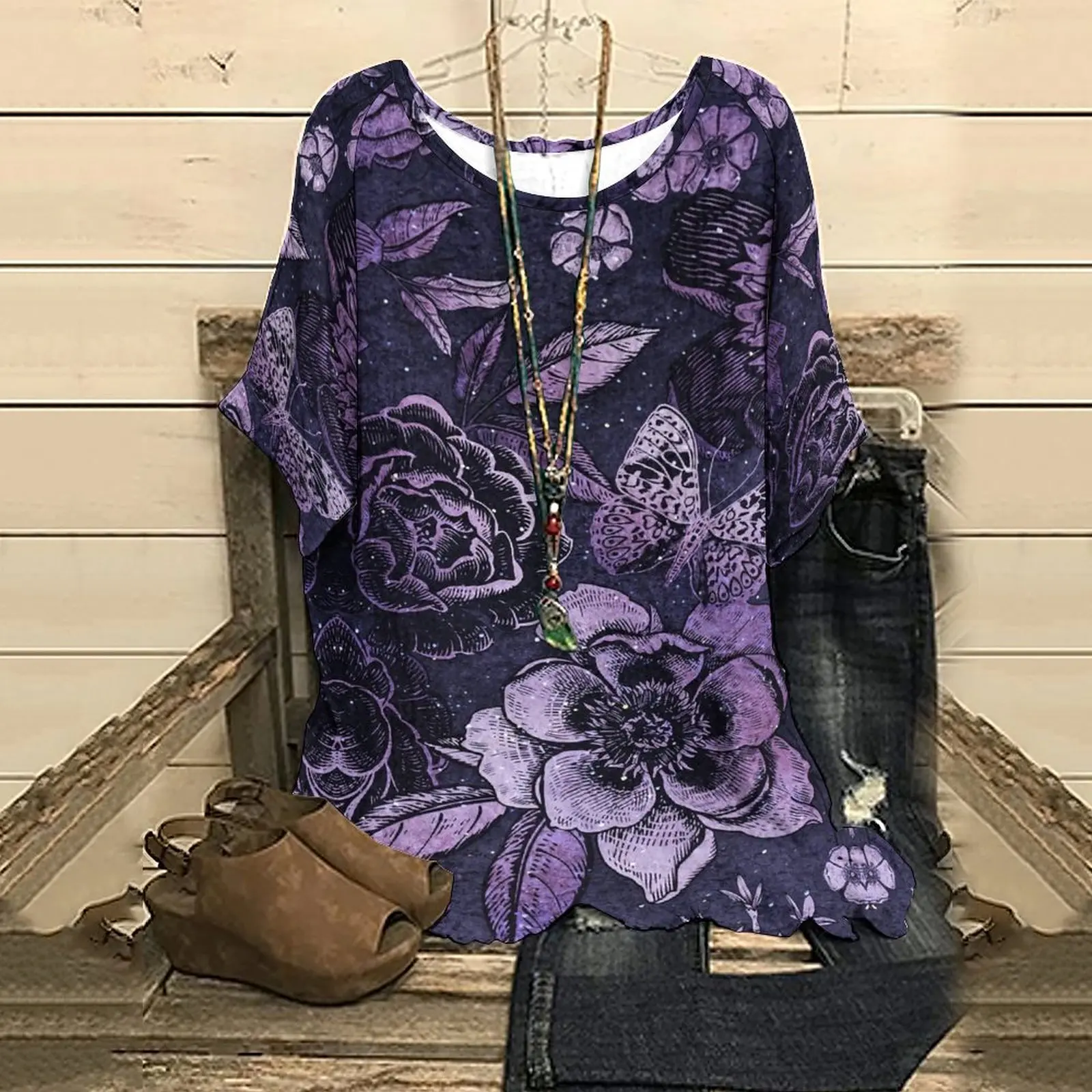 Женская блузка с рукавом до локтя, Элегантная модная летняя футболка с принтом бабочек и цветов, уличная одежда