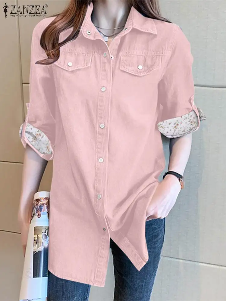 Женская блузка ZANZEA с отложным воротником, богемная рубашка с длинным рукавом, модные повседневные Лоскутные Блузы с цветочным принтом внутри, лето 2024