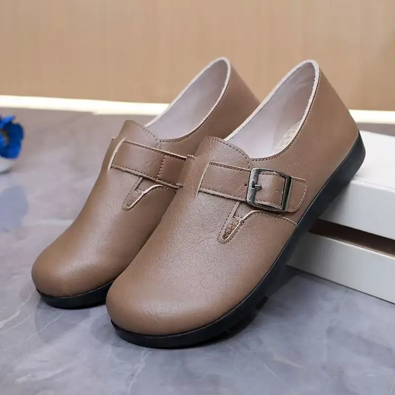 Женская весенне-осенняя кожаная повседневная обувь на плоской подошве, мягкая подошва, нескользящая водонепроницаемая легкая обувь телесного цвета с круглым носком на липучке для пожилых людей