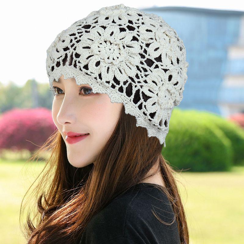 Женская весенне-осенняя тонкая вязаная крючком шапка с ажурным узором, сетчатая, дышащая, элегантная, ручной работы, с цветочным узором