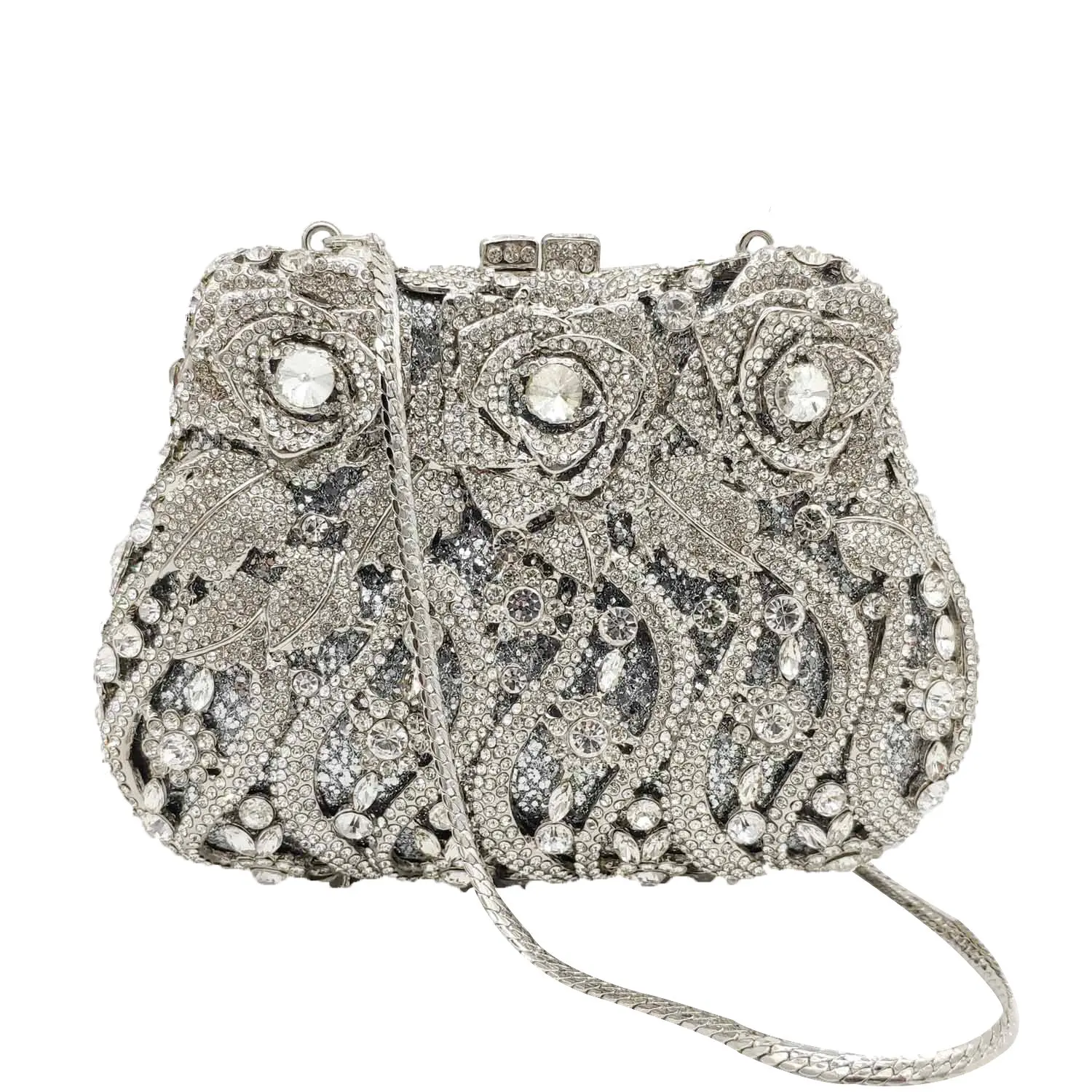 Женская вечерняя сумочка с двойным цветком и серебряными кристаллами
