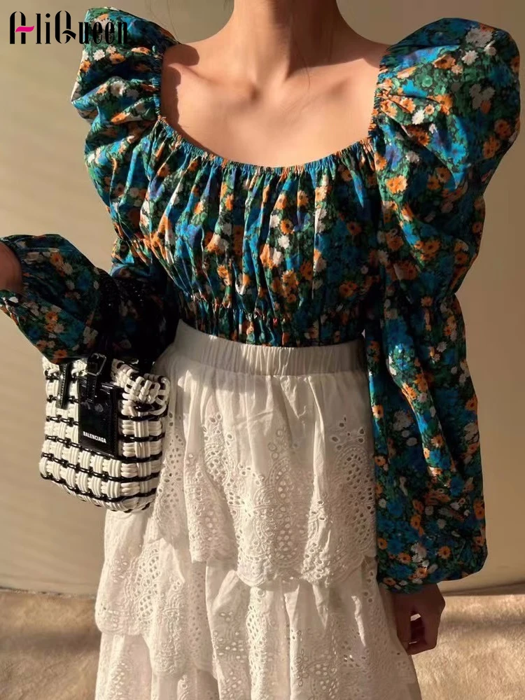 Женская винтажная блузка с длинным рукавом-фонариком и цветочным принтом