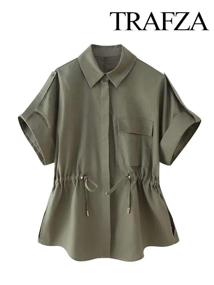 Женская винтажная блузка с коротким рукавом и декоративными карманами