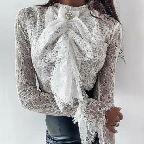 Женская винтажная кружевная блузка, элегантные пикантные Топы с длинным рукавом, ажурная кружевная шифоновая белая блузка с бантом, новинк...