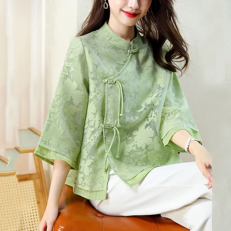 Женская винтажная рубашка с рукавом 2023, зеленая блузка с зелеными вставками, весна-лето 3/4