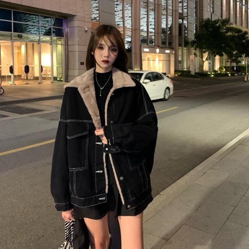 Женская джинсовая куртка Корейская версия Свободная повседневная рабочая одежда Хлопковая одежда Женская бархатная утолщенная хлопковая куртка в гонконгском стиле на осень и зиму XXL чёрный
