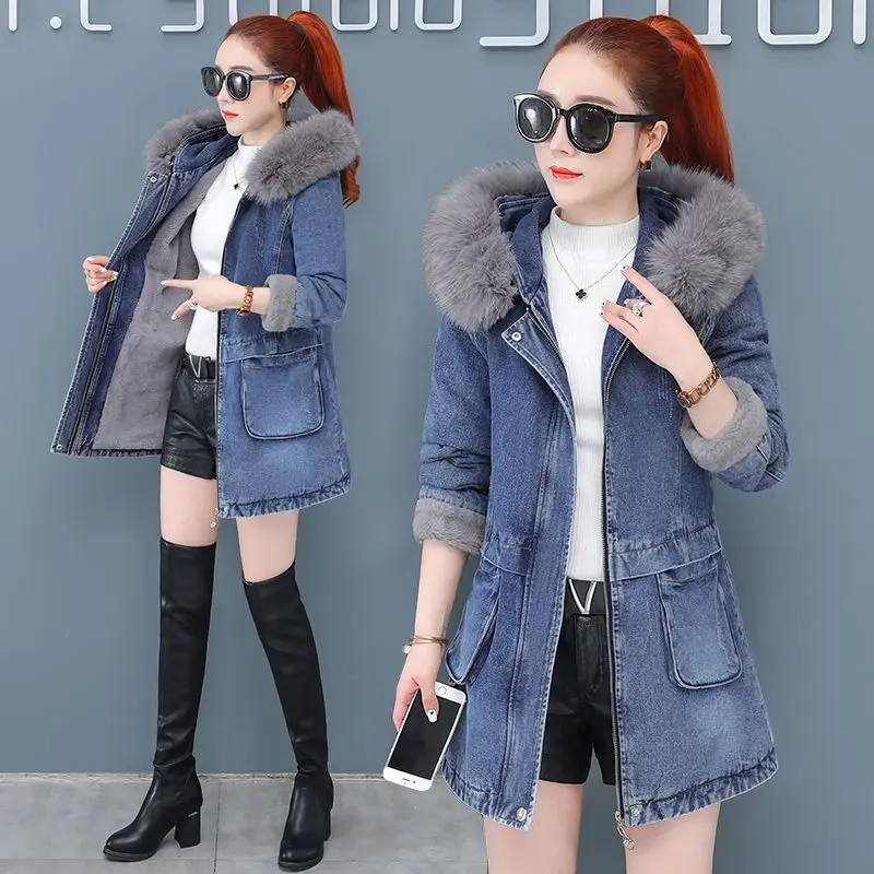 Женская джинсовая куртка средней длины, с большим меховым воротником