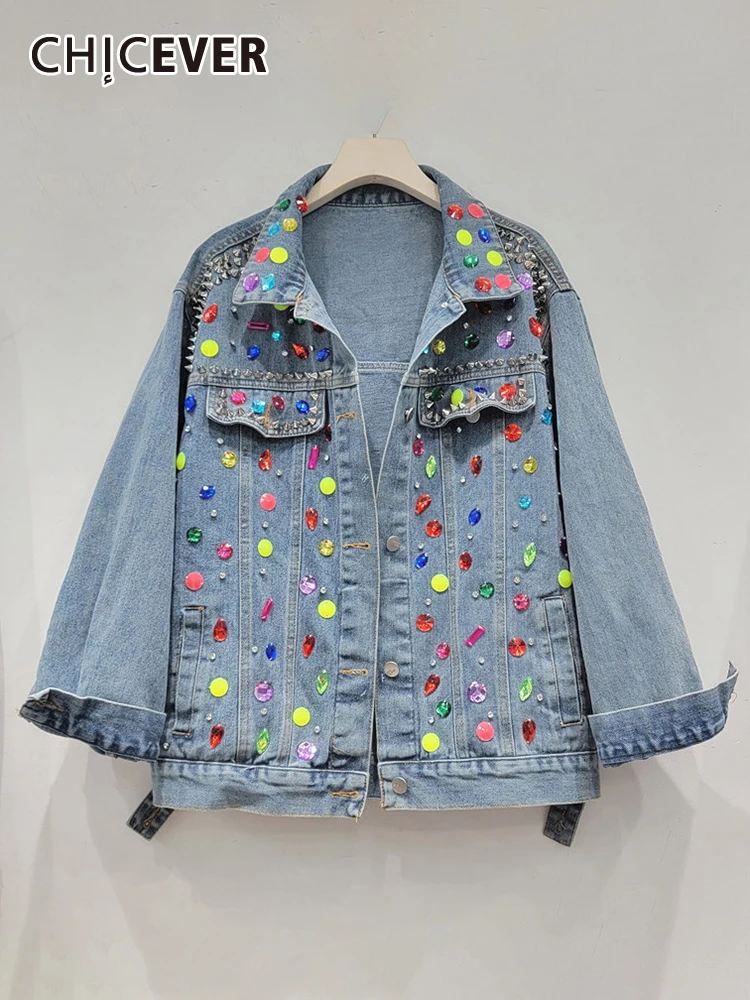 Женская джинсовая куртка с отложным воротником, длинным рукавом и стразами