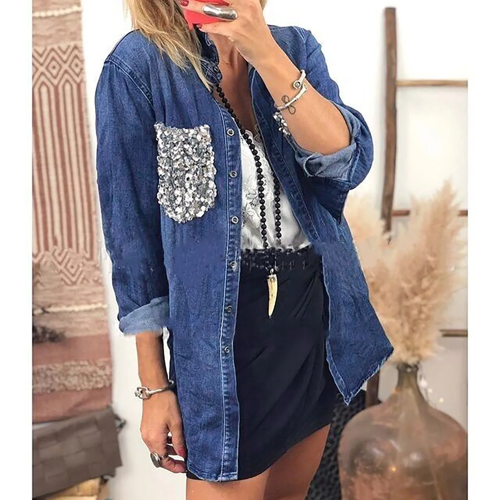 Женская джинсовая куртка с отложным воротником, с длинным рукавом