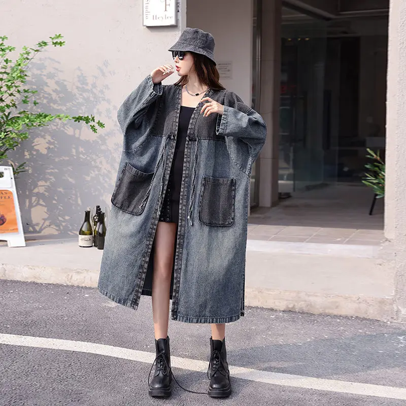 Женская джинсовая одежда большого размера, новинка 2022, винтажный свободный тренчкот средней длины контрастных цветов с V-образным вырезом в...