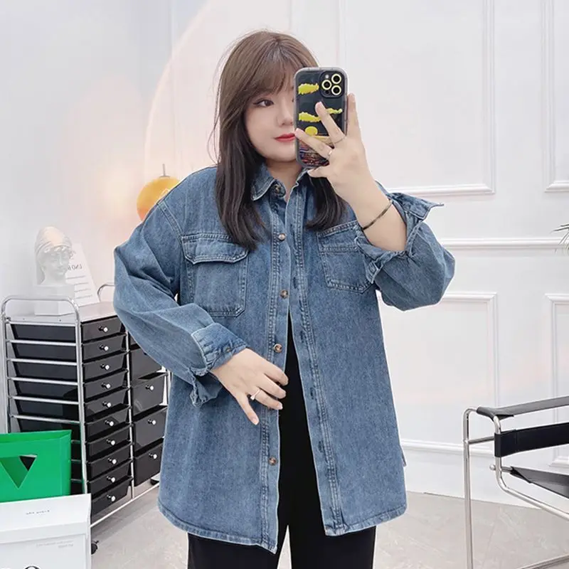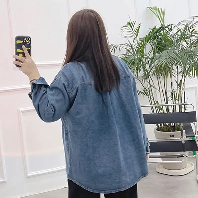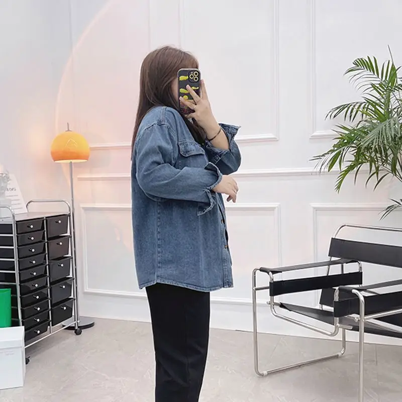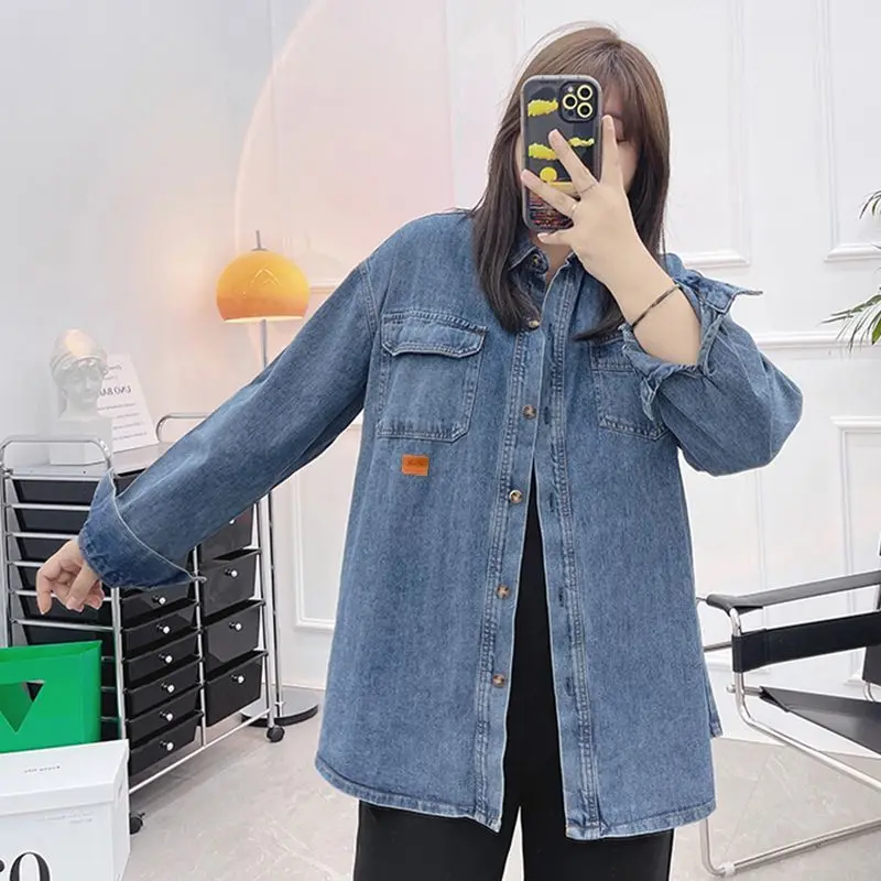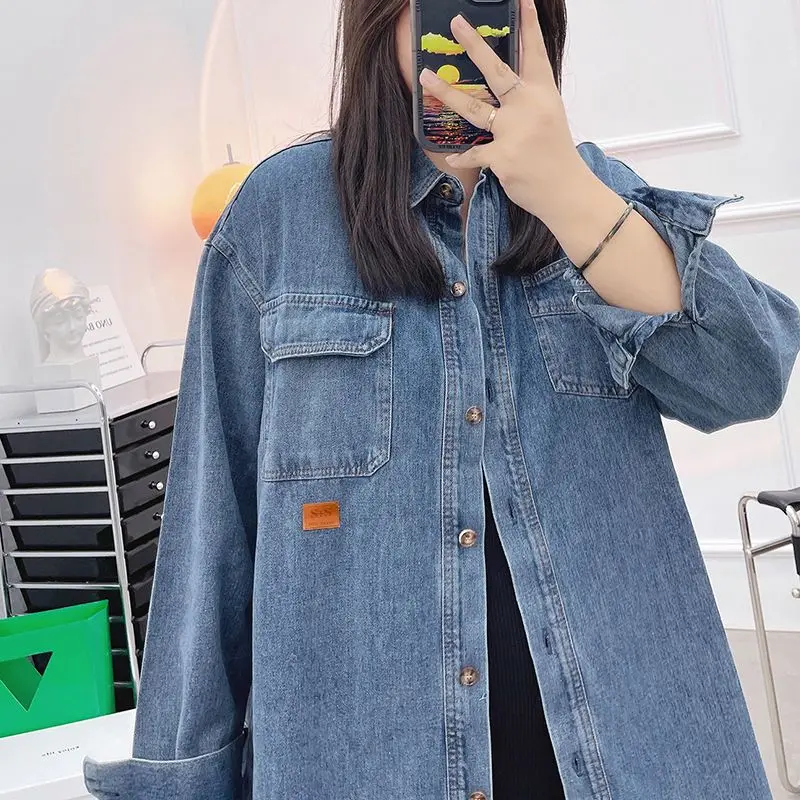Женская джинсовая рубашка с двойным карманом и длинным рукавом, свободного покроя