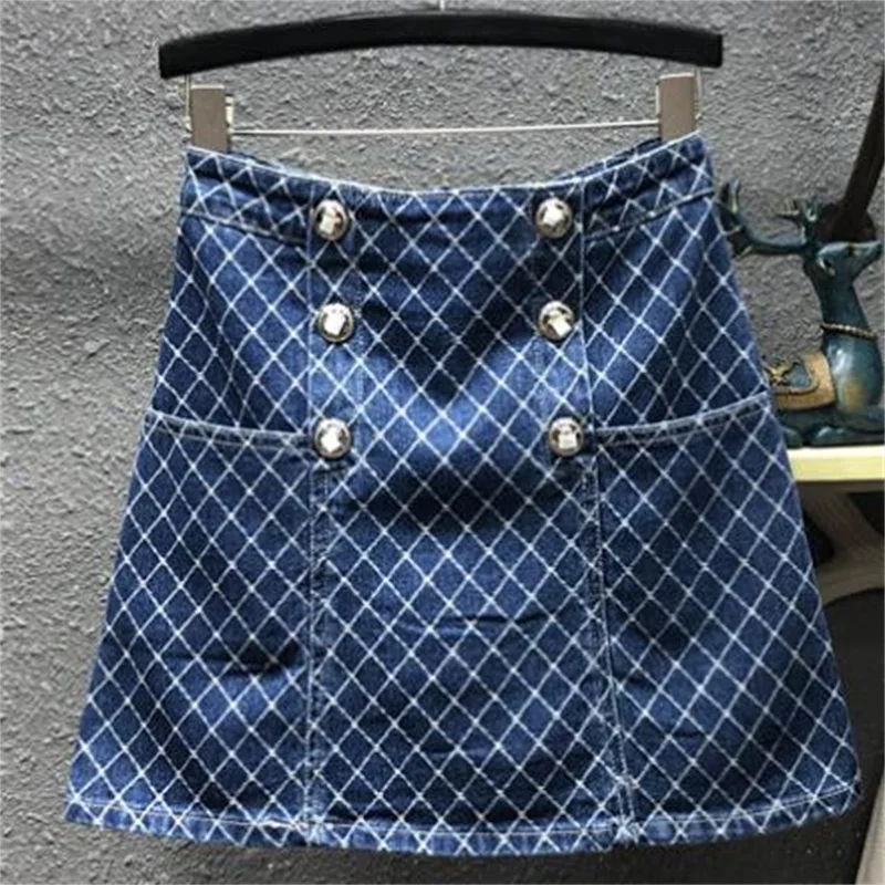 Женская джинсовая юбка в клетку, двубортная клетчатая юбка с высокой талией, лето 2022