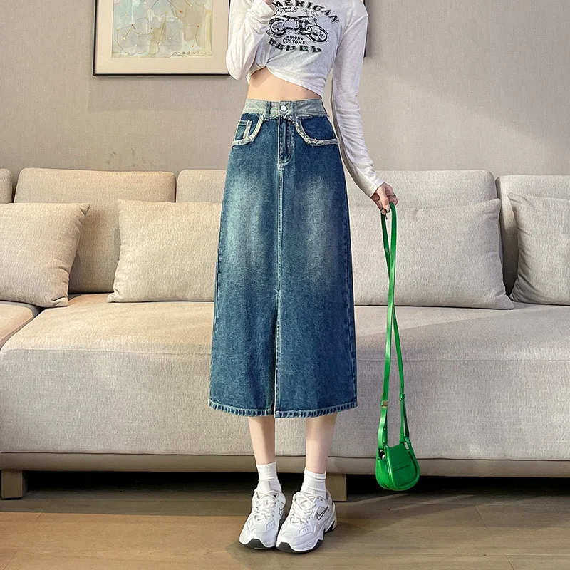 Женская джинсовая юбка средней длины, юбка из необработанного денима с разрезом, с завышенной талией, на весну и лето