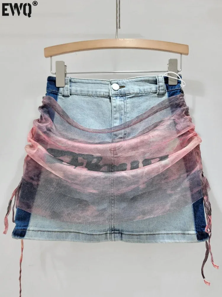 Женская джинсовая юбка с высокой талией [EWQ], черная джинсовая юбка со съемной сеткой и складками, с завышенной талией и оборками на бедра, 16U8972, весна-лето 2024