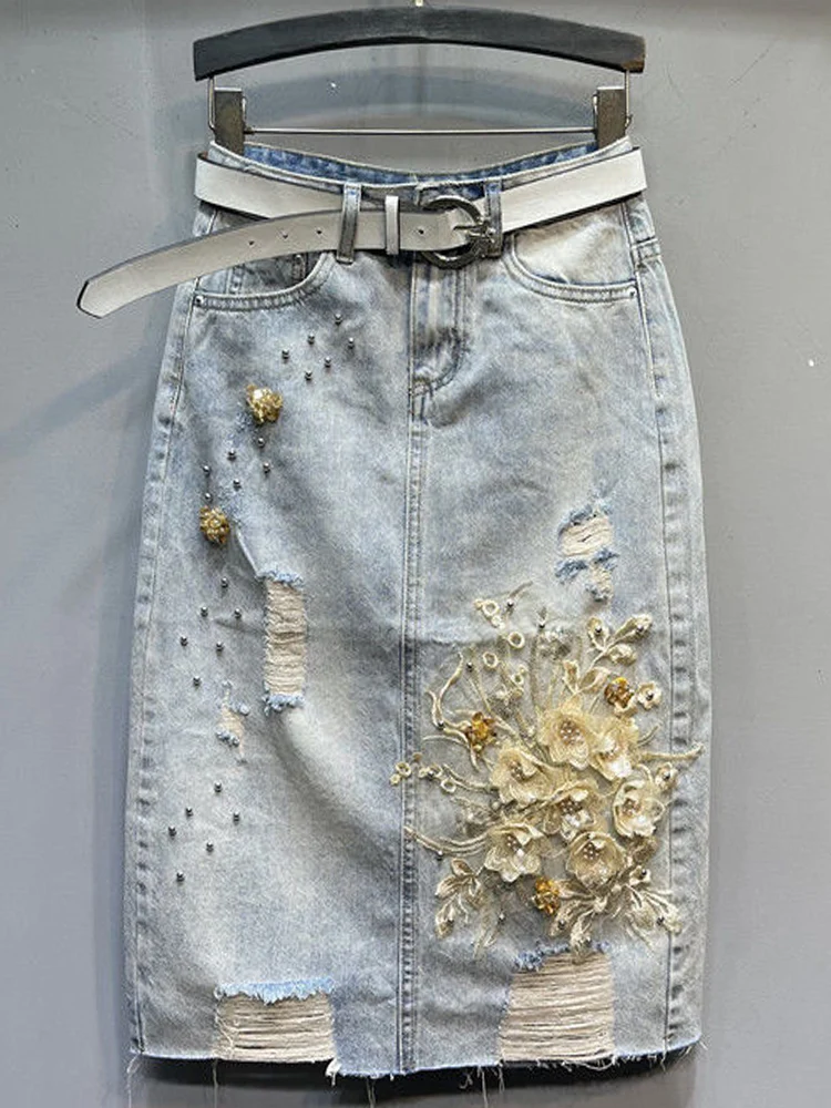 Женская джинсовая юбка с вышивкой из бисера, трехмерная трапециевидная юбка средней длины с цветочным рисунком и завышенной талией в уличном стиле, весна-лето 2023
