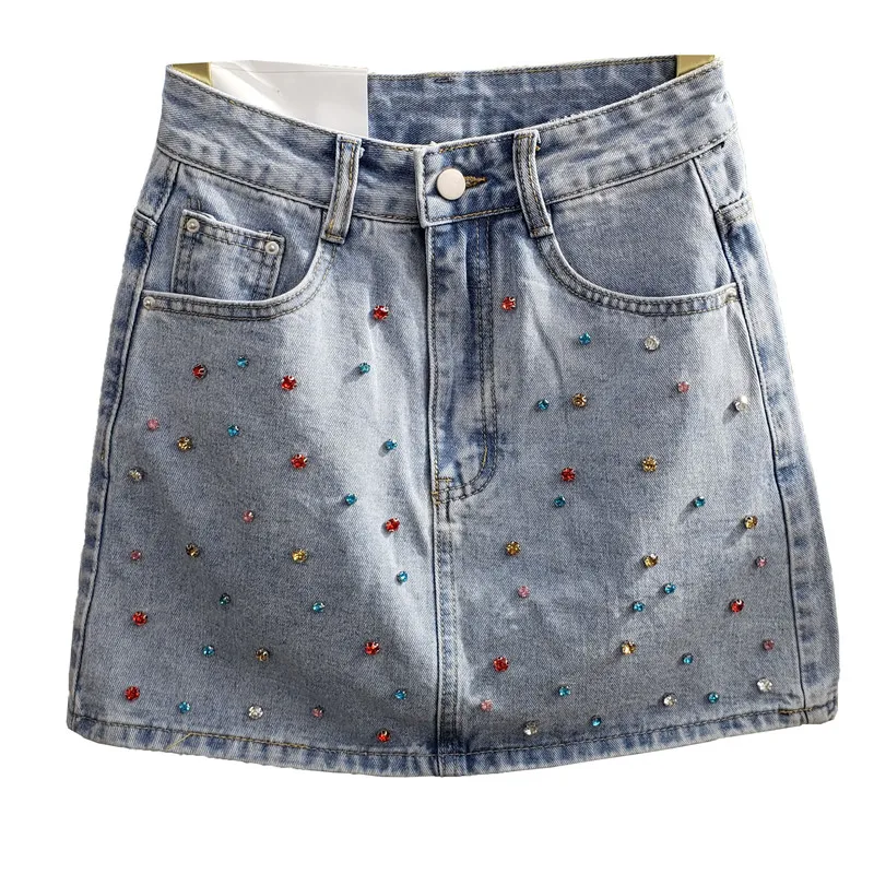 Женская джинсовая юбка с завышенной талией, трапециевидная юбка трапециевидной формы с цветными бриллиантами, лето 2022