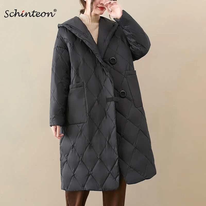 Женская длинная куртка на утином пуху Schinteon, теплая осенне-зимняя верхняя одежда с капюшоном и воротником, большой размер, Свободное пальто, ...