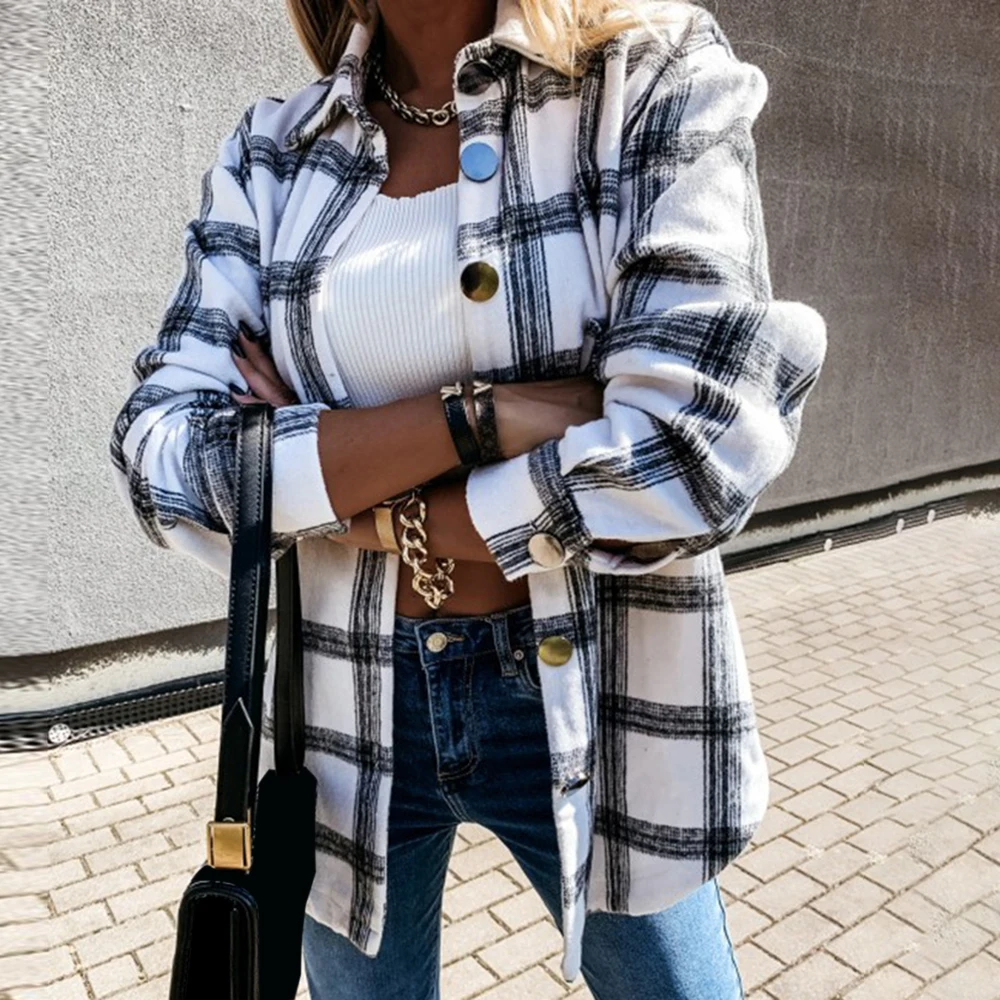 Женская длинная рубашка в клетку, Повседневная Свободная рубашка в клетку на пуговицах, с длинным рукавом и карманами, с воротником на пугов...