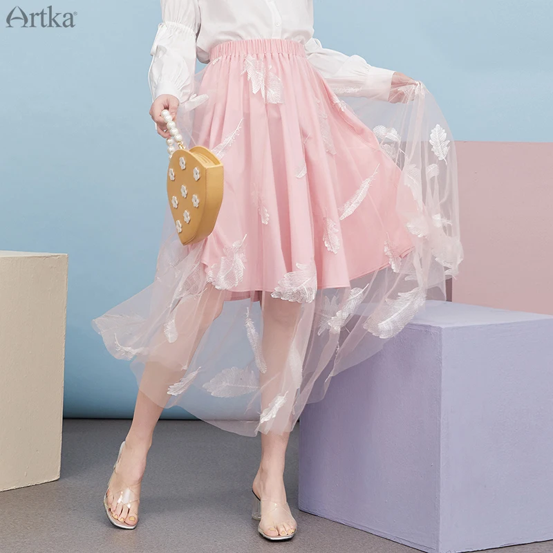 Женская длинная юбка с вышивкой ARTKA, розовая элегантная юбка составного кроя с перьями на резинке, модель QA25001Q на раннюю осень 2020