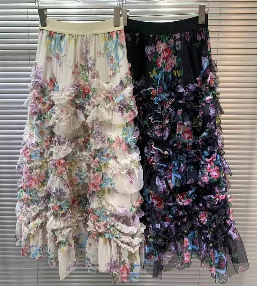 Женская длинная юбка с поясом на резинке, Повседневная Длинная сетчатая юбка макси с каскадными оборками, лето 2023