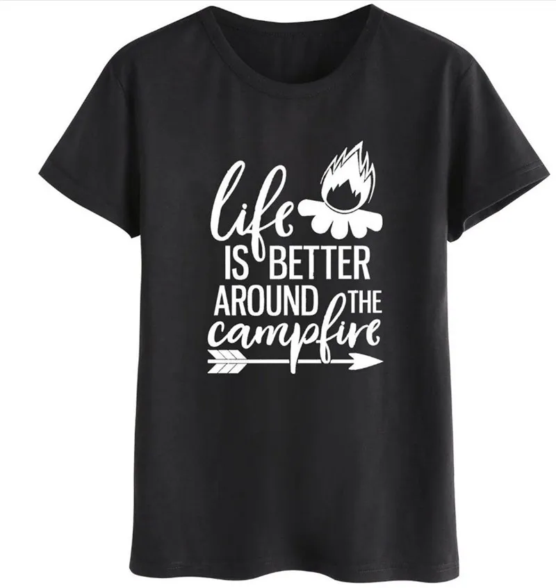 Женская жизнь лучше вокруг костра, черная забавная футболка с надписью, модный эстетичный топ с круглым вырезом, мягкая Цветочная футболка