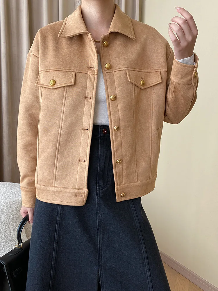 Женская замшевая куртка в полоску, с длинным рукавом и отложным воротником