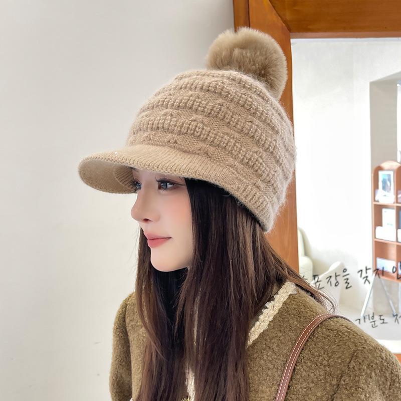 Женская зимняя вязаная шапка-бини с козырьком и ушами, помпоном из искусственного меха, пушистая, толстая, теплая, уличное сплошное, с мягкими манжетами One size верблюд