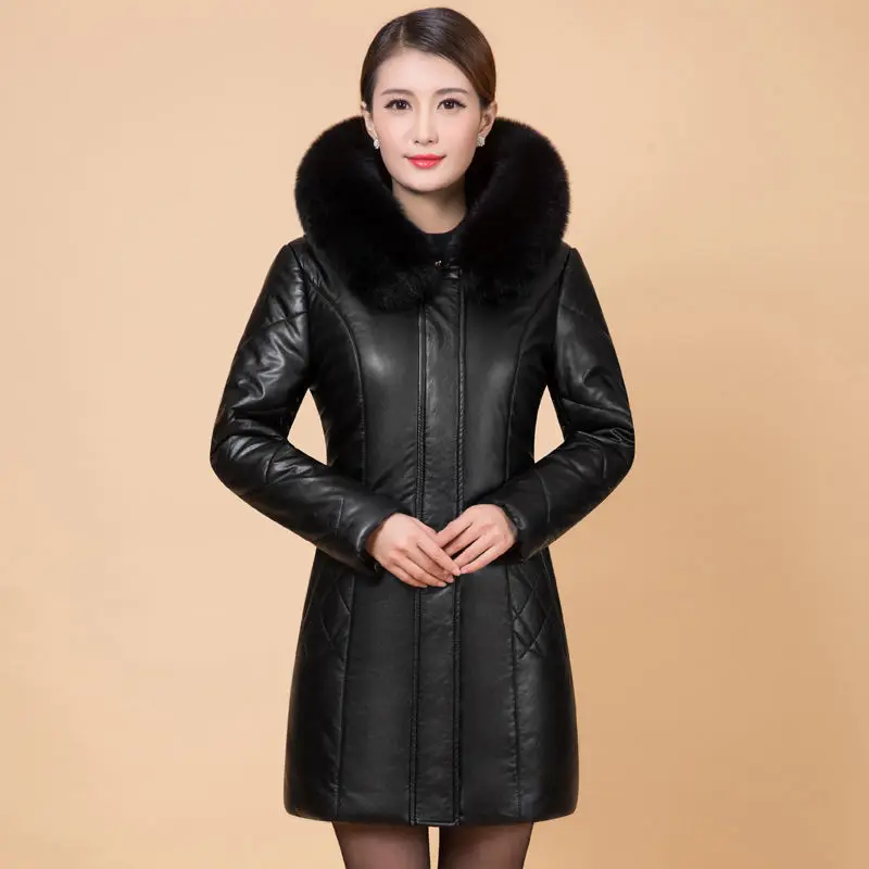 Женская зимняя куртка из искусственной кожи, средней длины, с меховым воротником
