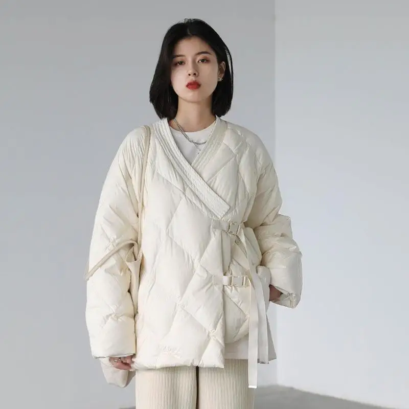 Женская зимняя куртка на белом утином пуху с V-образным вырезом и шортами
