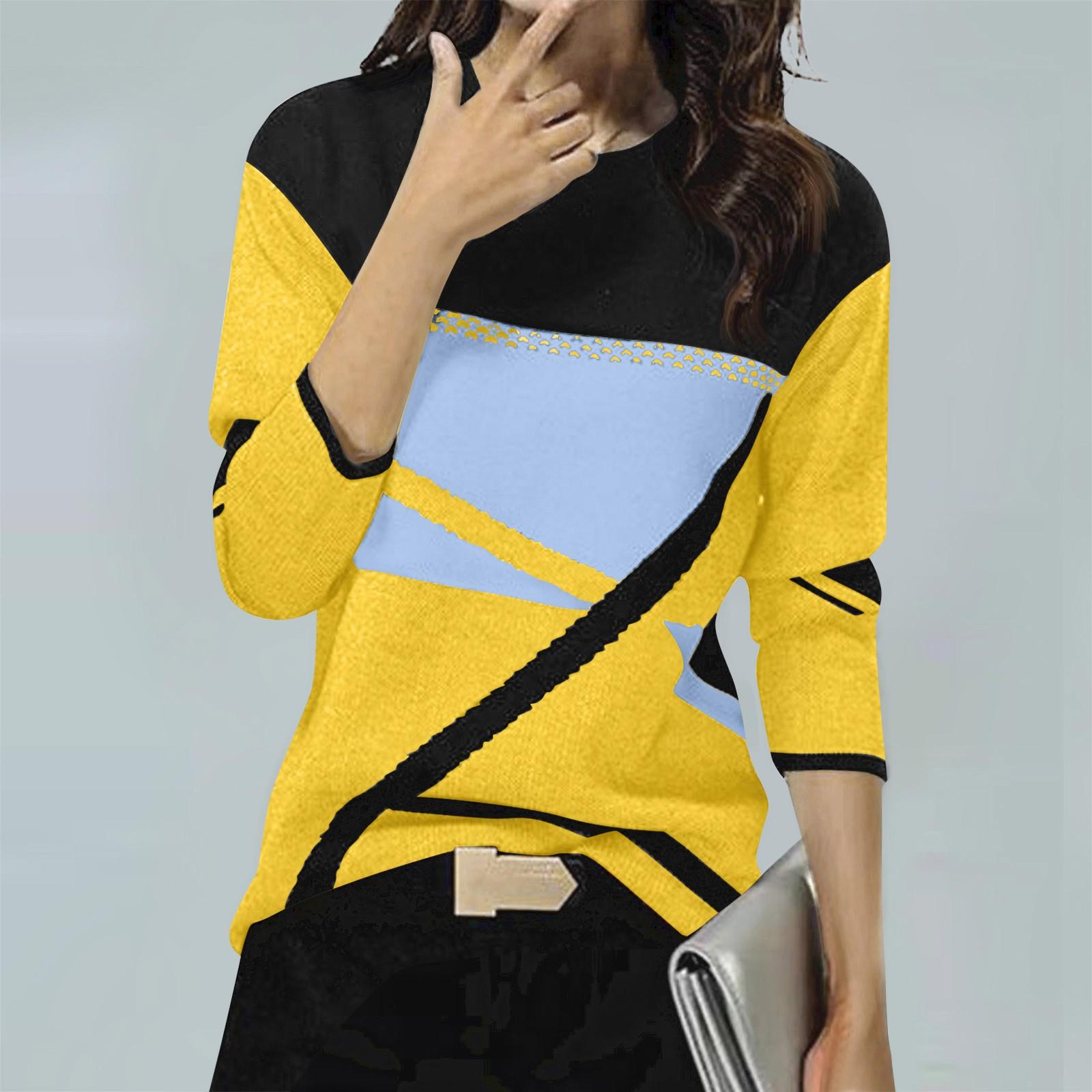 Женская зимняя мода с контрастным позиционированием и принтом с круглым вырезом и длинными рукавами XL жёлтый