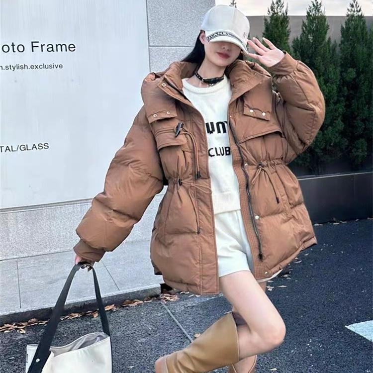 Женская зимняя осенняя куртка-пуховик с воротником-стойкой, белая, свободная, короткая, однотонная, с большим карманом, ветрозащитная, утолщенная, с капюшоном M кофейный