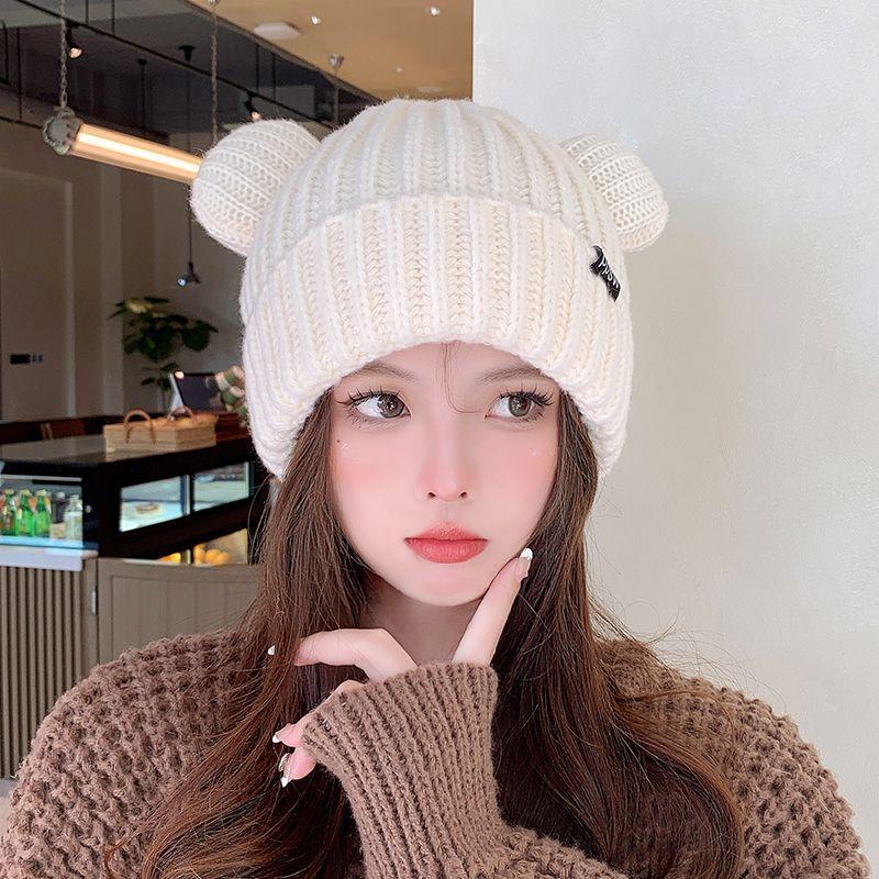 Женская зимняя толстая шапка с милыми маленькими медвежьими ушками, свободная шерстяная шапка, теплая, стократная, маленькая вязаная шапка