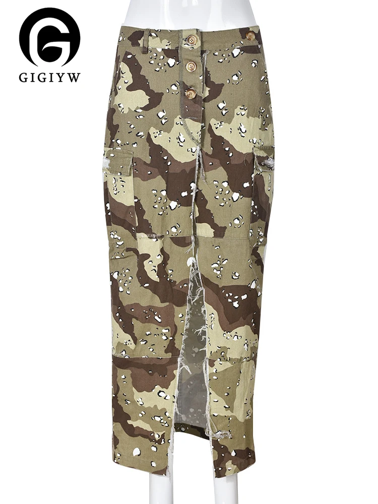 Женская камуфляжная юбка GIGIYW, юбка с высокой талией, с разрезом и кисточками, модная женская одежда, новинка 2023