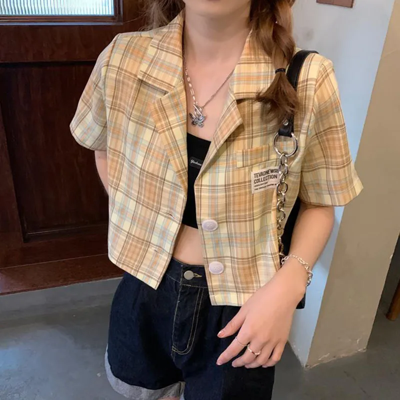 Женская клетчатая куртка с коротким рукавом в студенческом стиле, корейская мода, тонкая женская универсальная куртка на пуговицах