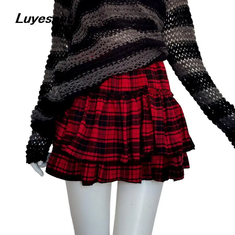 Женская клетчатая мини-юбка в готическом стиле, черная или красная юбка средней длины в полоску с оборками и поясом на резинке, Y2k