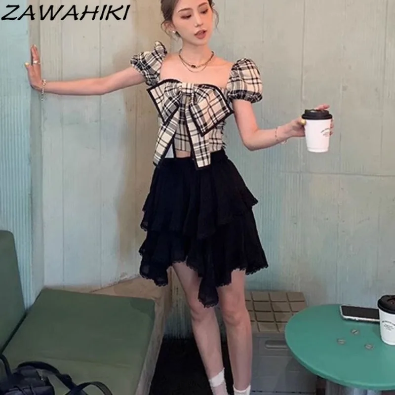 Женская клетчатая рубашка с коротким рукавом-фонариком и квадратным вырезом