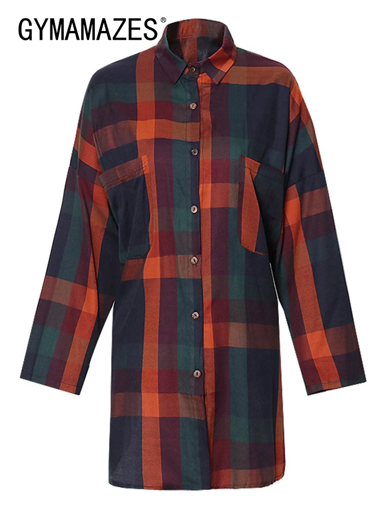 Женская клетчатая рубашка с отложным воротником, длинным рукавом и карманами