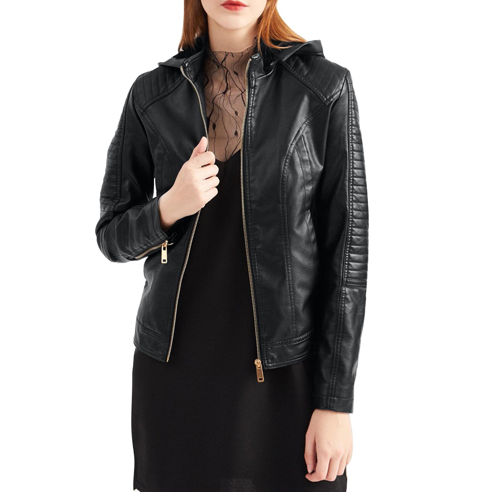 Женская кожаная куртка с капюшоном, короткая куртка на осень и зиму, теплая повседневная куртка M чёрный