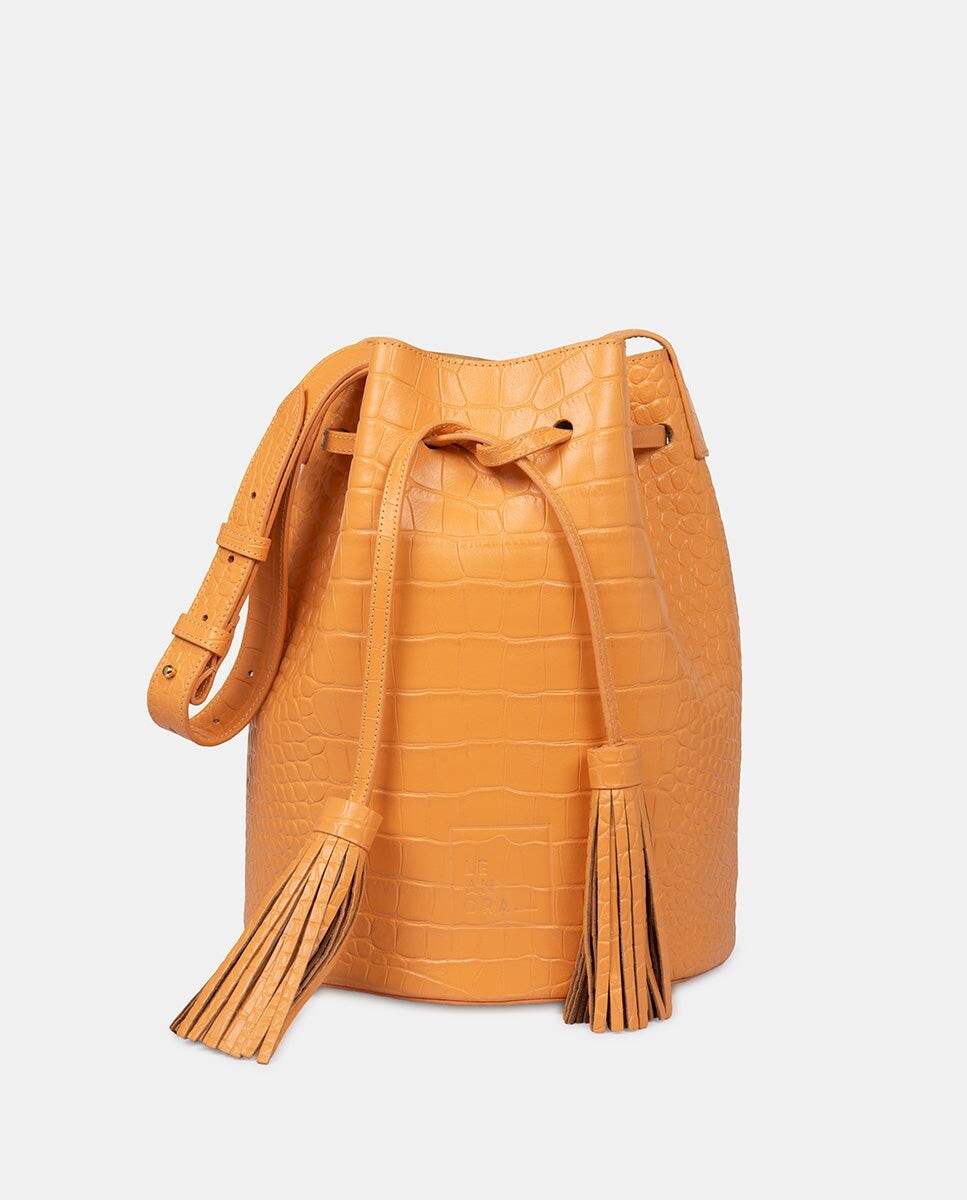 Двусторонняя сумка-мешок из мягкой кожи с гравировкой кокосового ореха цвета грейпфрута производства Испании, с выгравированным логотипом бренда на передней стороне сумки. Роскошный тон и внутренняя часть из замши телесного цвета. Имеет кружевную застежку и длинную регулируемую ручку с запонками. Внутри имеется карман на магните с выгравированным на коже логотипом бренда.