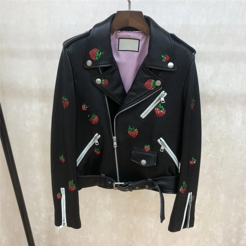 Женская короткая байкерская куртка из натуральной овечьей кожи с блестками