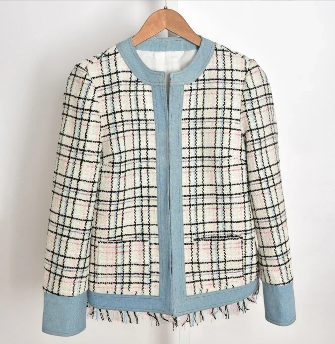 Женская короткая куртка, Весенняя клетчатая однобортная куртка с джинсовой строчкой и бахромой