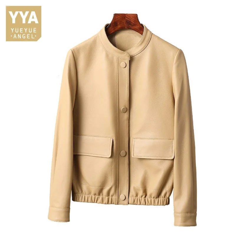 Женская короткая мотоциклетная куртка из натуральной кожи, с воротником-стойкой