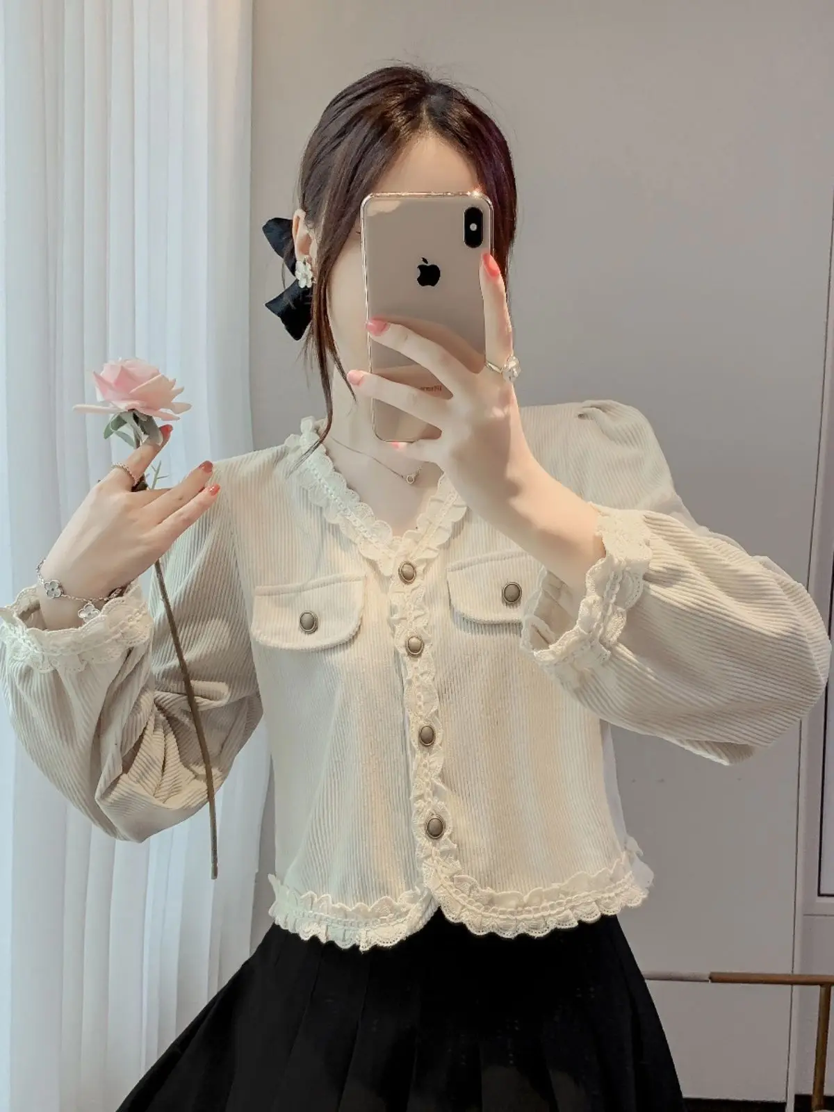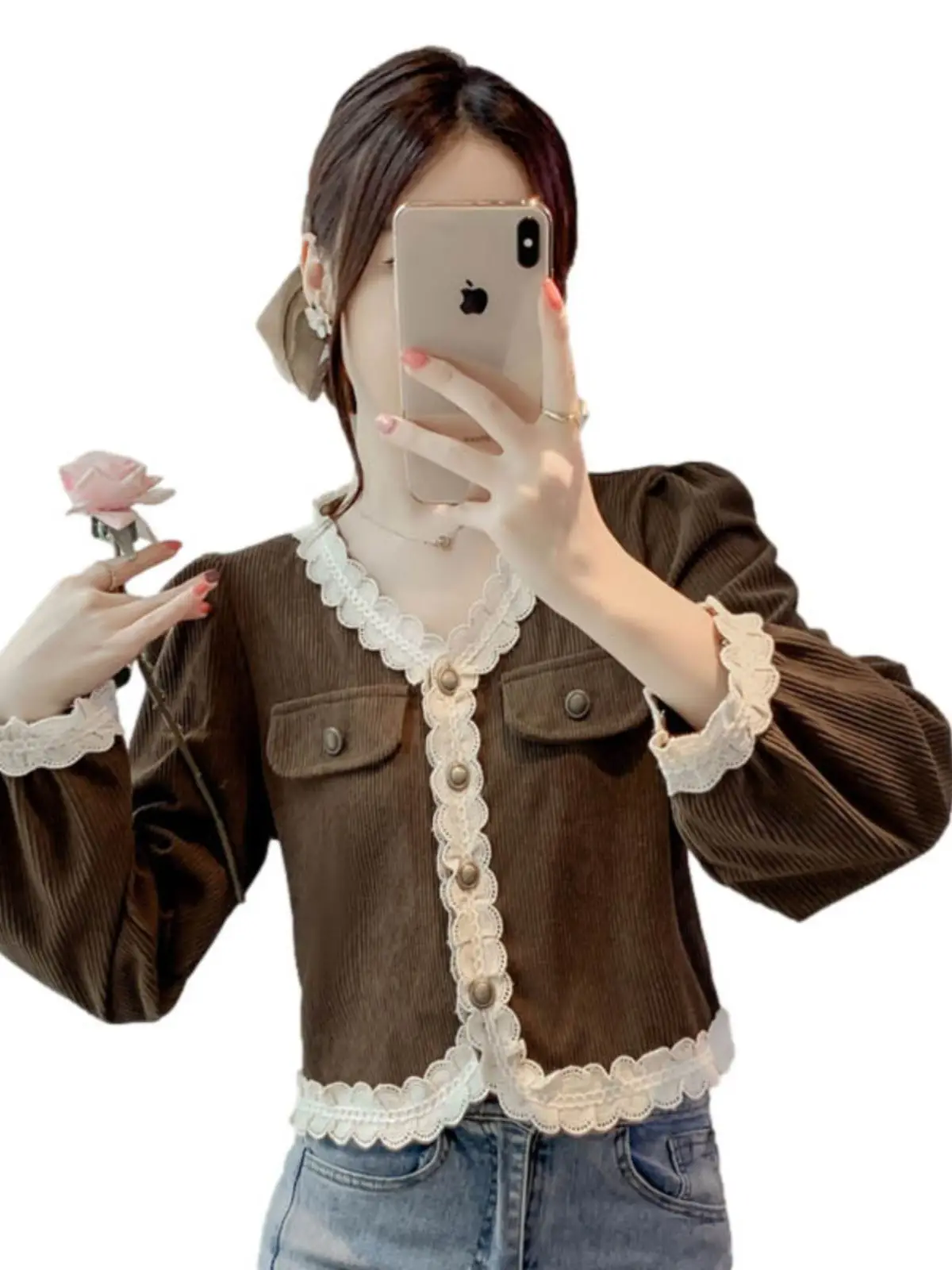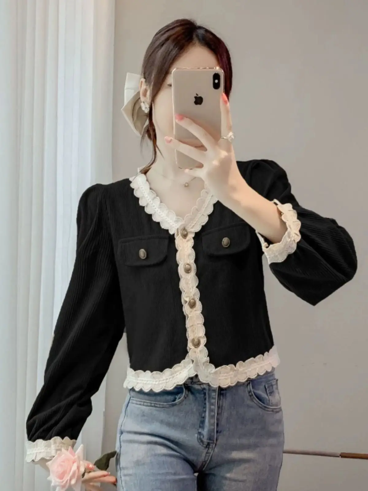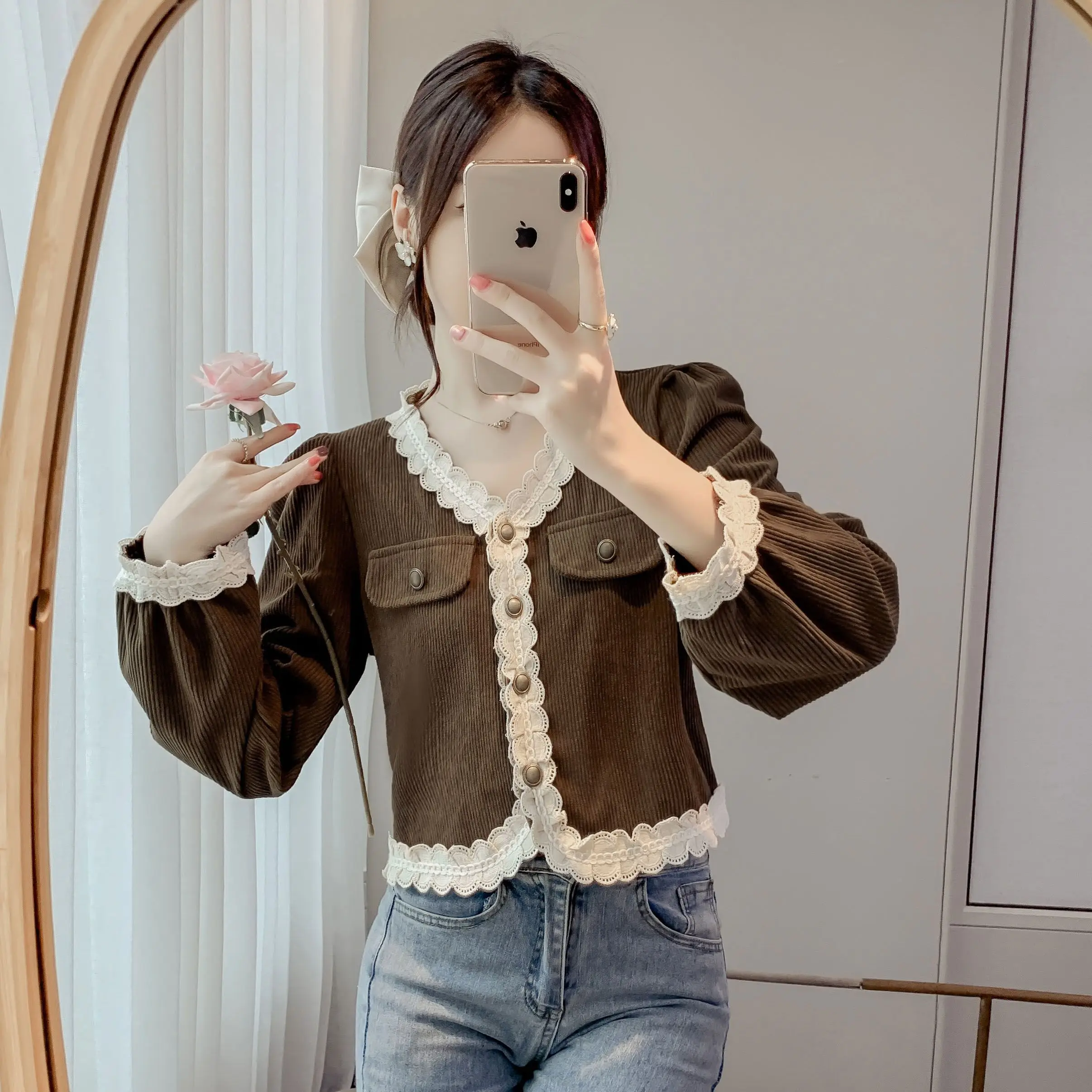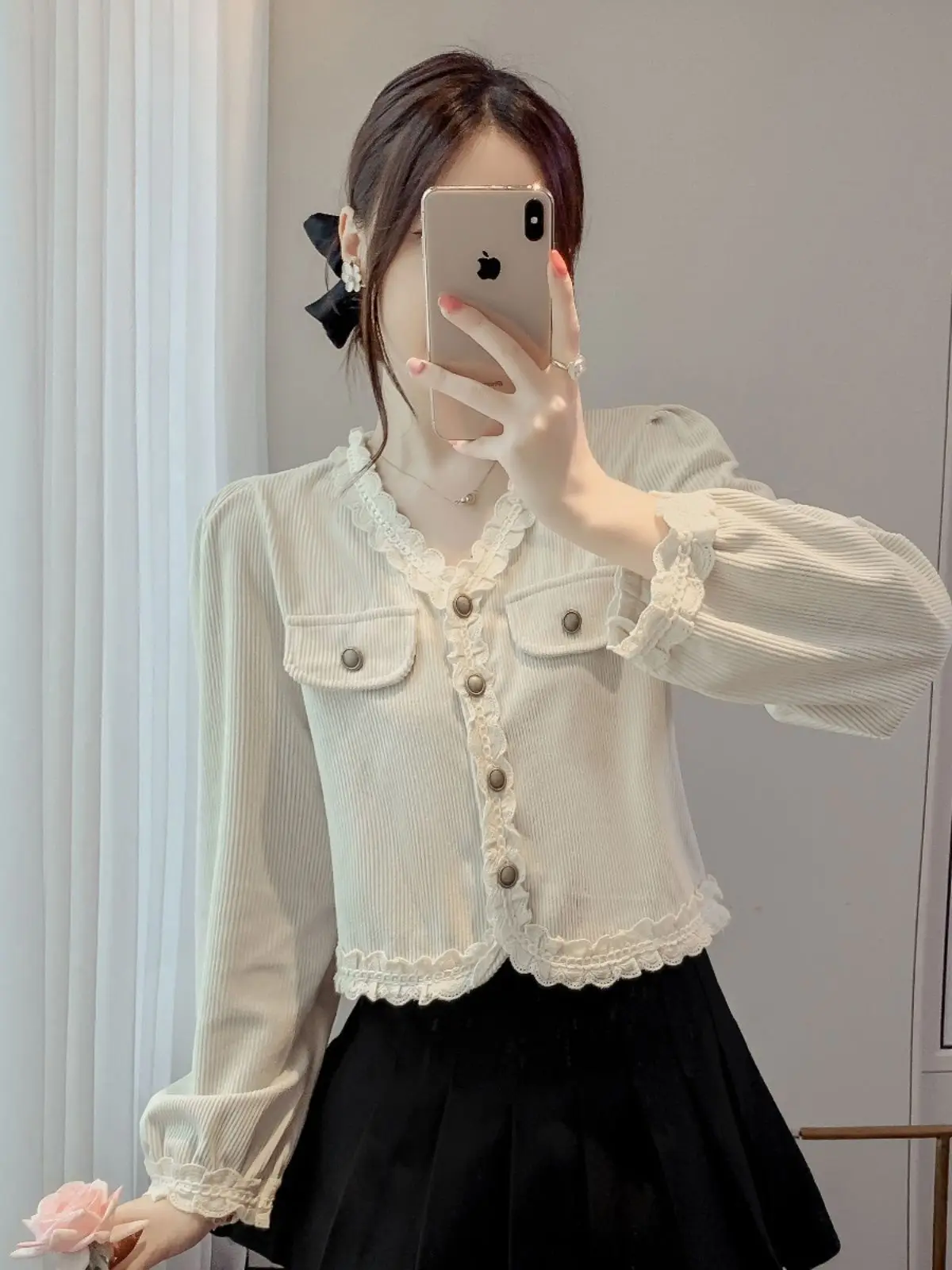 Женская короткая рубашка с V-образным вырезом, кружевная рубашка с длинным рукавом, на пуговицах, весна-осень 2024